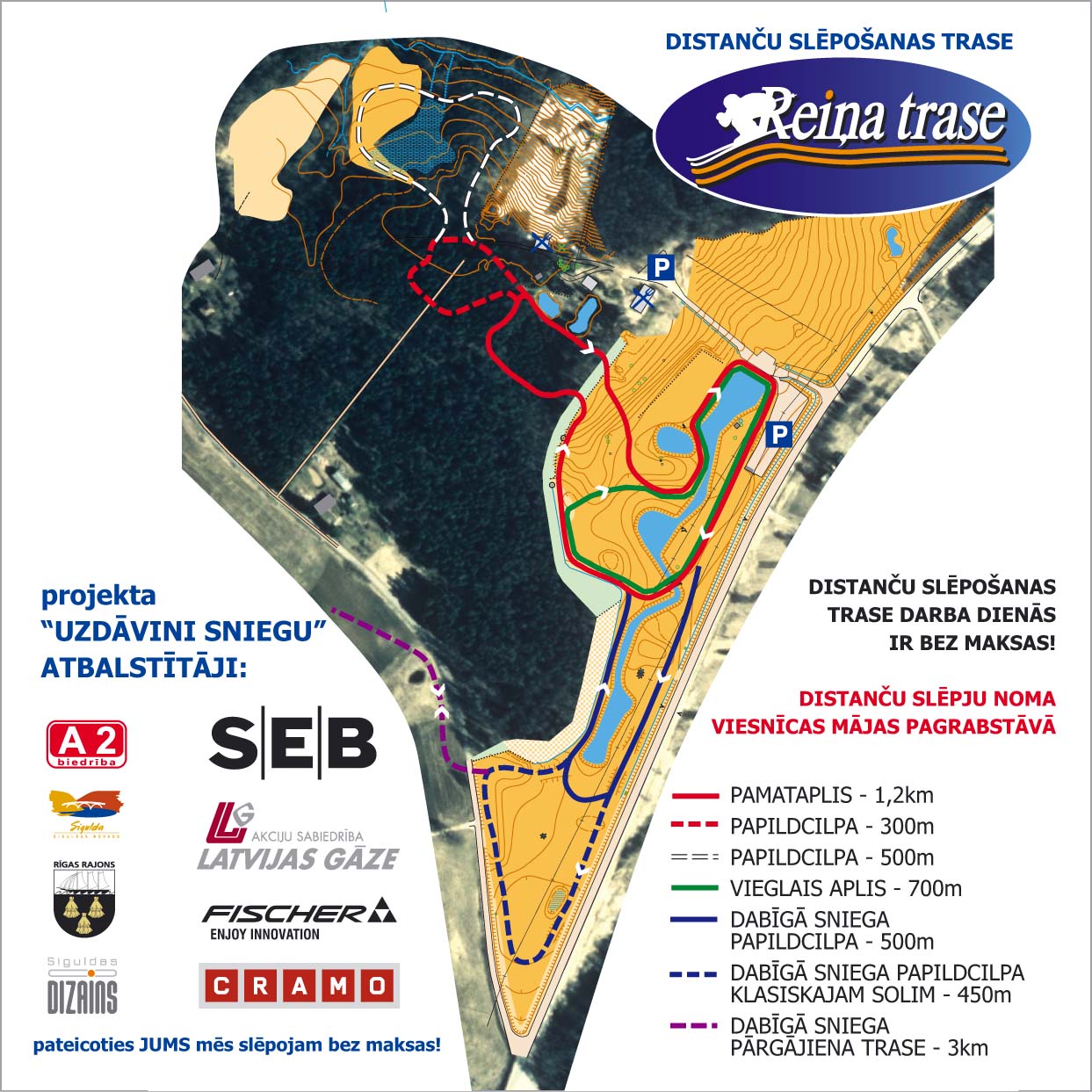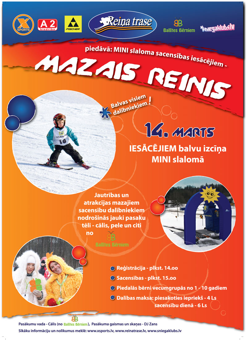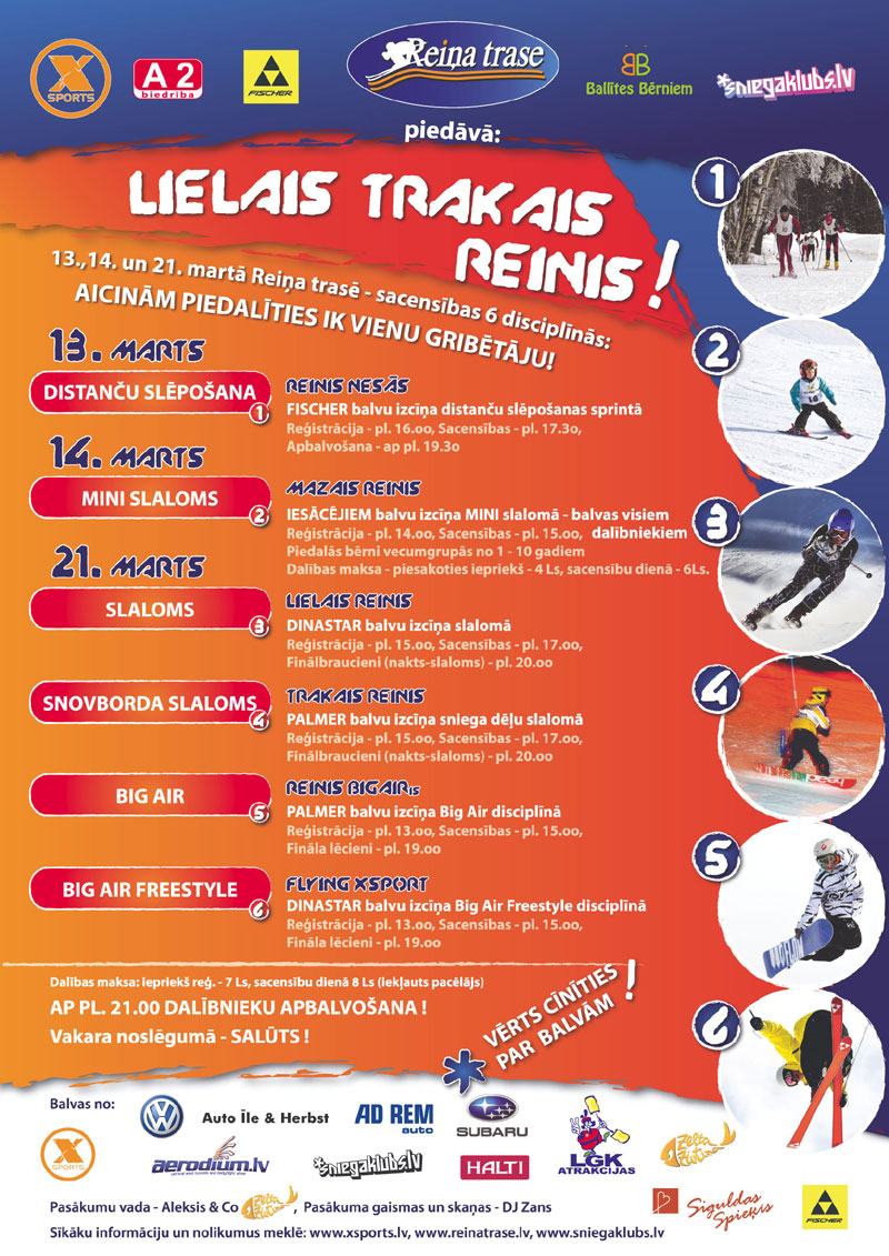 Piedāvājam instruktora pakalpojumus ar iepriekšēju pieteikšanos. Tālrunis informācijai 29368877. LAIKA ZIŅAS TRASES SHĒMA SACENSĪBU KALENDĀRS 3.-4.02. Skandināvijas kauss / Baltic ski tour sprints 1,3km/ 10;15km 21.02. Tautas slēpojums SIGULDA 2010 18km (Silciemā) 27.02. Siguldas kauss 2010 sprints1,3km iedzīšana 5km 5.-7.03. II Latvijas Ziemas Olimpiāde sprints / ind / stafete Svētdien 15. februārī veiksmīgi noslēdzies 7. FIS Marathon Cup posms - 38. Tartu maratons. Protams, maratona ziedu laiki, kad dalībnieku skaits sasniedza vairāk kā 10 tūkstošus vēl nav atgriezušies, bet neskatoties uz to organizatori norāda, ka šogad pieteikto dalībnieku skaits abām distancēm 5200 ir lielākais pēdējos 20 gados. Mums ir tas gods rīkot lielākas latvijā distanču slēpošanas sacensības Skandināvijas kausu sprintā. Tas ir ļoti atbildīgs izaicinājums, jo pēc mūsu paveiktā sacensību dalībniekiem veidosies priekštats par Latviju un latvijas sportu kopumā. Šajos ekonomikas pastākļos tas ir divtik krūtāk, bet zinu, ka mēs spēsim un sarīkosim svētkus ārzemju un pašmāju sportistiem. Sacensības tiks filmētas un pārraidītas tiešraidē esporta portālā, kā arī varēs sekot līdzi uz lielā ekrāna rezultātiem tiešsaitē. Lai kvalitatīvi sarīkotu sacensības ir nepieciešami tiesneši, kas tiesā, apsargā, palīdz, regulē un vēl daudzos citos pienākumos. Tāpēc aicinu brīvprātīgos tiesnešus palīdzēt veiksmīgi novadīt šīs sacensības. Jūsu palīdzība ir vajadzīga 4.02. pēcpusdienā, vakarā sacensību centra un trases iekārtošanā un 5.02. padienu iekārtotot centru un vakarā sacensību laikā. Par darbu varam pateikties tikai ar siltām pusdienām vai vakariņām. Interesentiem lūgums dod ziņu Jānim Lazdānam pa e-pastu:info@siguldasdizains.lv ar atzīmi brīvprātīgais tiesnesis. Jau iepriekš paldies, Sacensību direktors Jānis Lazdāns. 2008. gads Visu sezonu - Katru dienu bez maksas slēpošana Reiņa trasē - Biedrība A2 sadarbībā ar atbalstītājiem 27. decembris - Publiskā slēpošanas apmācība. Klasiskais solis. Bez maksas - Biedrība A2 sadarbībā ar atbalstītājiem 28. decembris - Publiskā slēpošanas apmācība. Slidsolis. Bez maksas - Biedrība A2 sadarbībā ar atbalstītājiem 2009. gads 25. janvāris - Rīgas rajona čempionāts distanču slēpošanā starp pagastu un pilsētu komandām. - A2 sadarbībā ar Rīgas rajona Sporta Iniciatīvu centru 22. februāris - Tautas slēpojums SIGULDA 09 un Rīgas rajona atklātais čempionāts - A2 sadarbībā ar Siguldas novada domi un Rīgas rajona Sporta Iniciatīvu centru 6. marts - Rīgas rajona Pašvaldību Sporta spēles - A2 sadarbībā ar Rīgas rajona Sporta Iniciatīvu centru un Krimuldas pagastu 14. marts - FISCHER balvu izcīņa sprintā REINIS NESĀS - A2, OY PATROL |